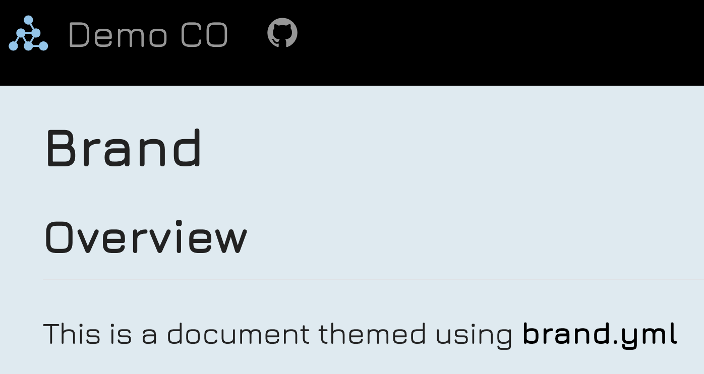 Beyond the automatic application of your brand file, you can also directly access _brand.yml values in Quarto documents. In this section, you’ll learn how to use the brand shortcode, use brand variables in SCSS files, and some format-specific ways to use access brand values.