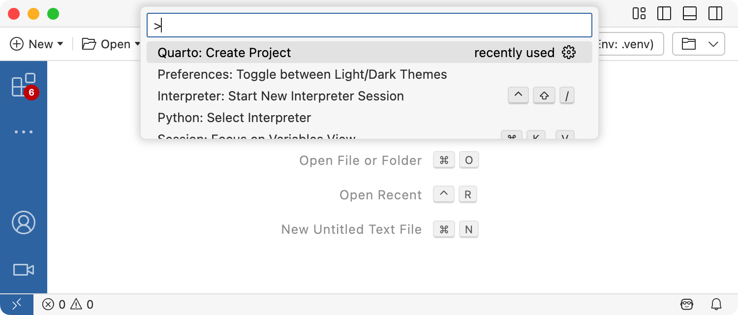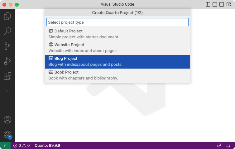 To create a new blog project within VS Code, execute the Quarto: Create Project command from the command-palette: