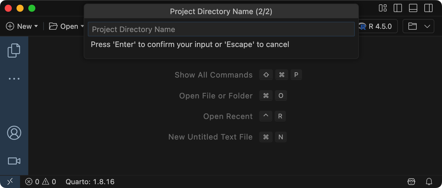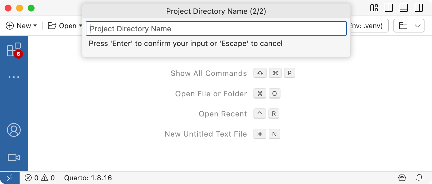 To create a new blog project within Positron, execute the Quarto: Create Project command from the command-palette: