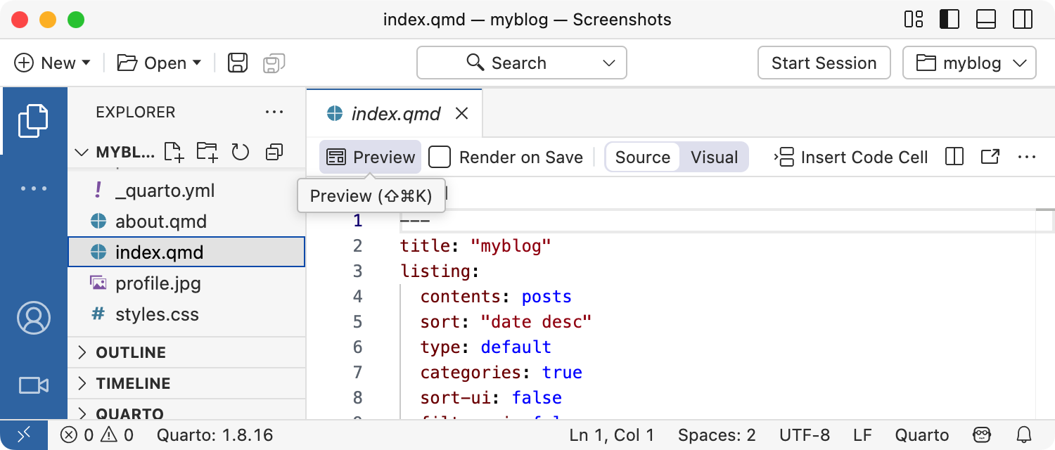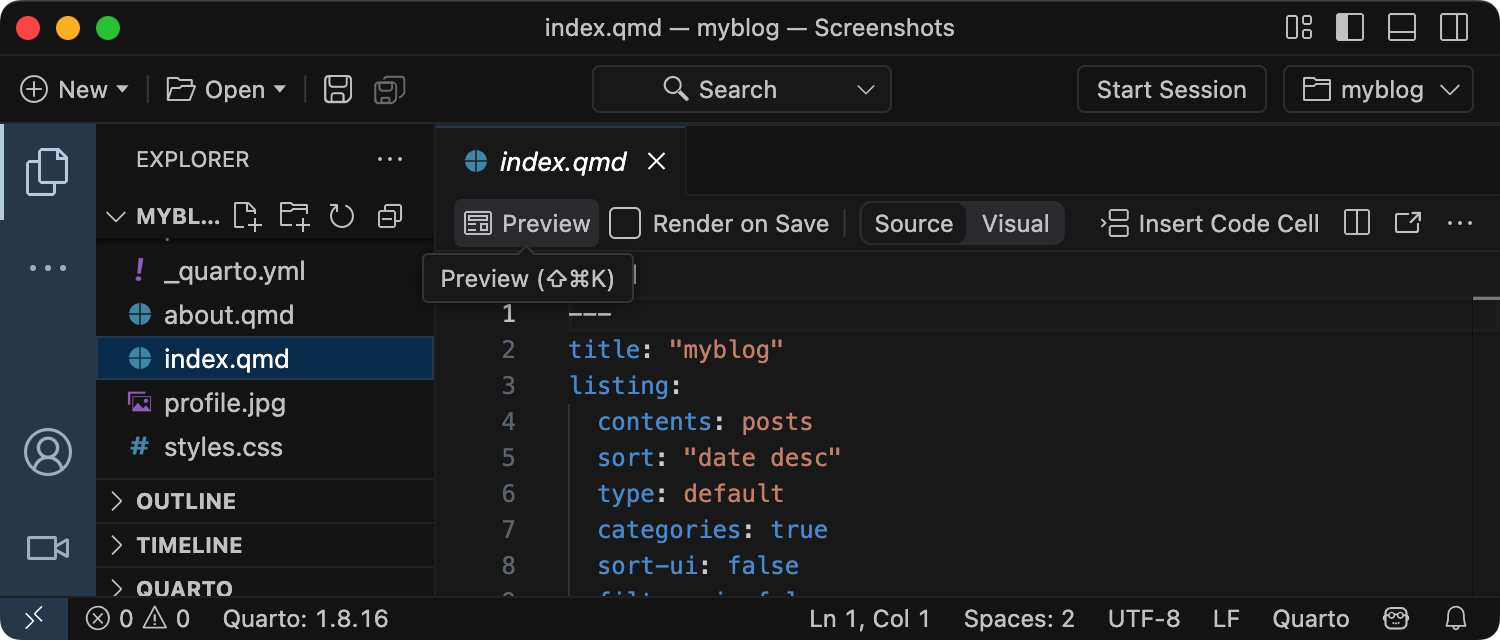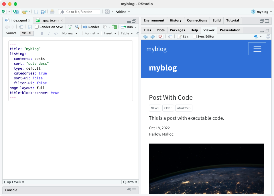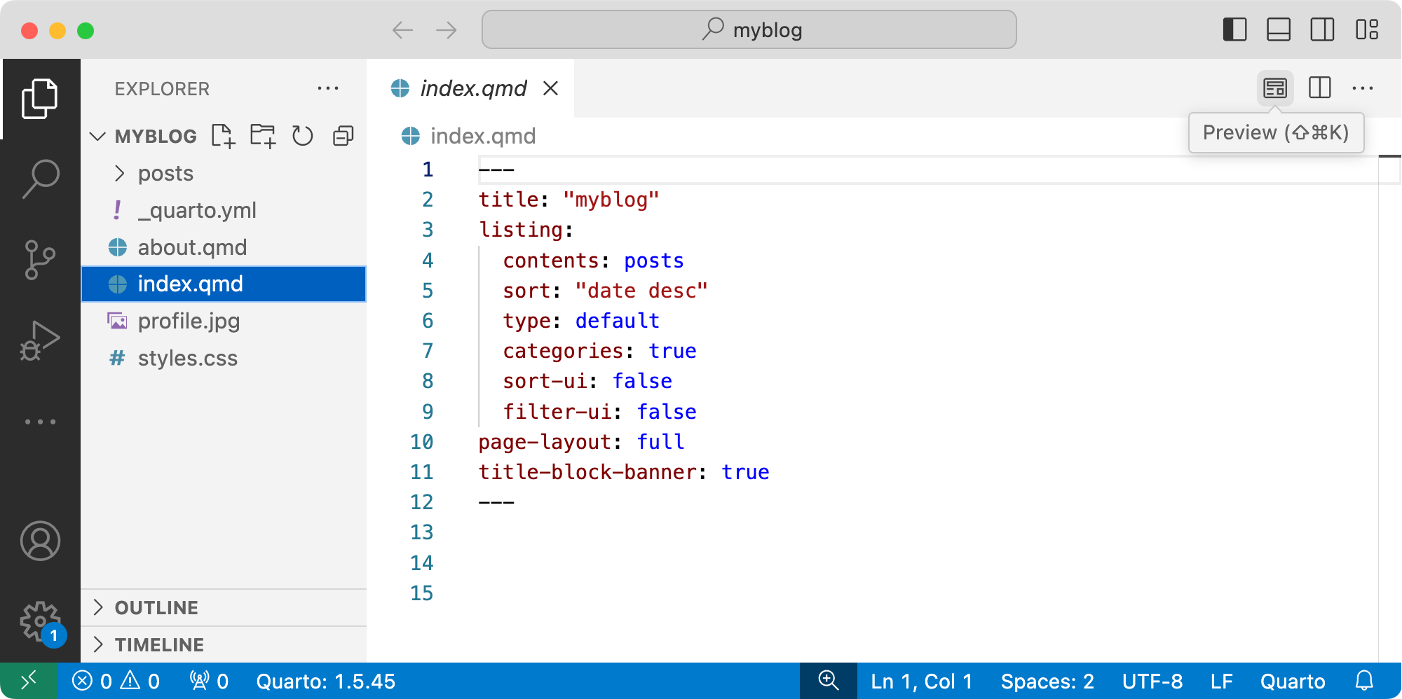 quarto preview myblogThe blog preview will open in a new web browser. As you edit and save index.qmd (or other files like about.qmd) the preview is automatically updated.